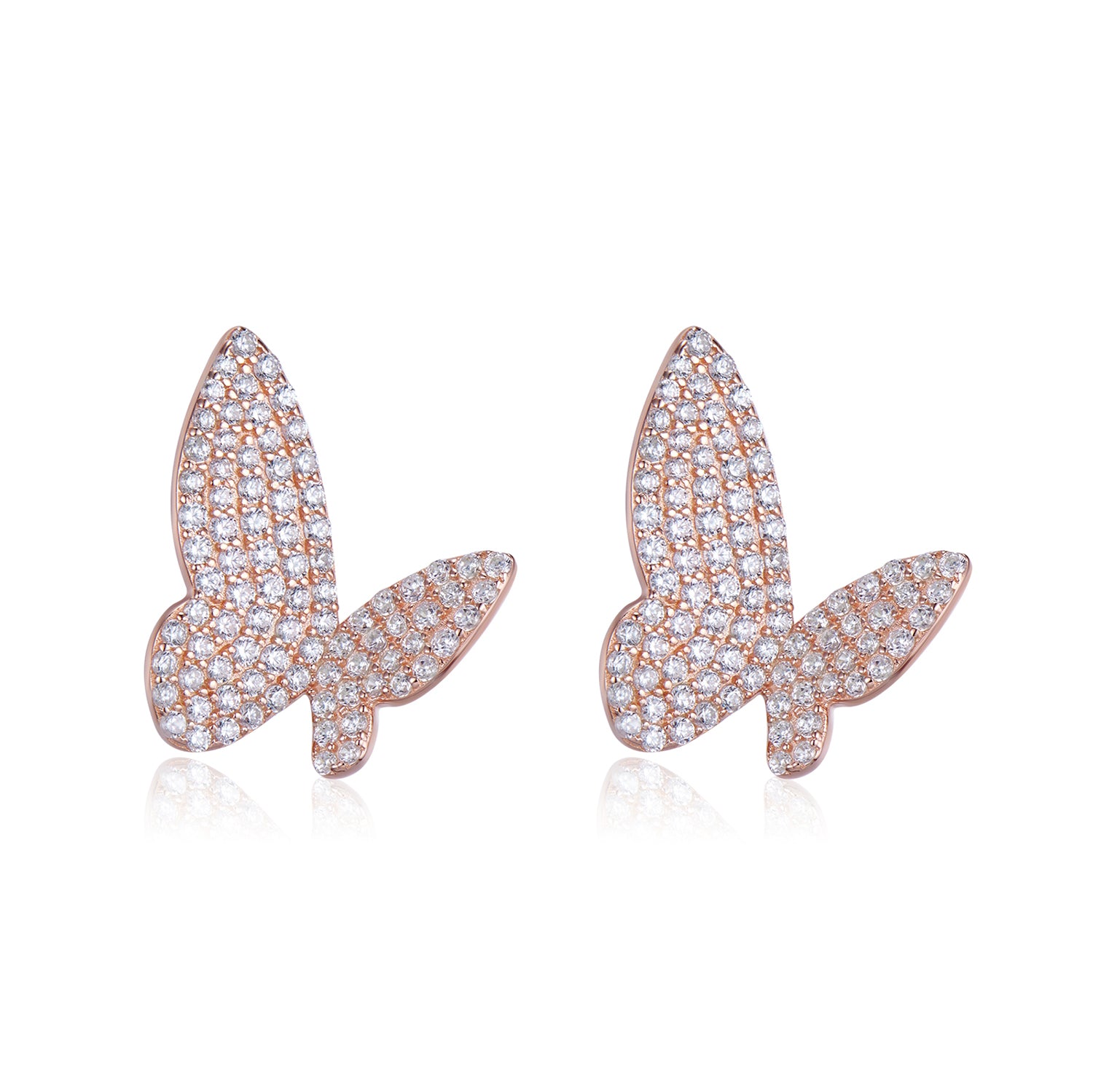 Embrace delicate metamorphosis with our Enchanted Wings Earrings, featuring ethereal butterfly designs crafted in 18K rose gold plating and adorned with sparkling cubic zirconia "diamond" accents. These whimsical studs capture the magic of nature's most graceful creature, designed to add a touch of enchantment to everyday wear.